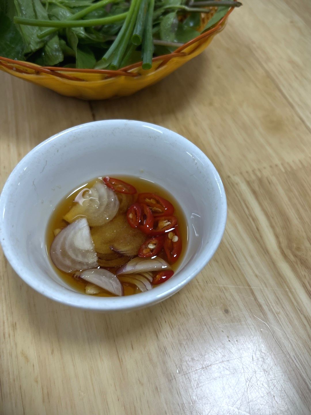 소스는 베트남 답게 느억맘이다. 그리고 함께 나오는 것들도 베트남 답게 각종 향채들이 나온다. 향채가 여러가지 있는데 잘 골라먹어야 한다.