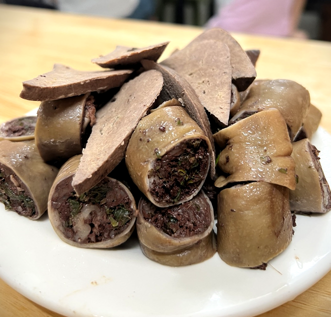 순대와 죽을 같이 시키면 보통 순대가 먼저 나온다. 겉모습은 한국의 대창순대와 비슷하고 속은 선지와 야채 그리고 비계로 가득 차 있다. 상당히 고소하다.