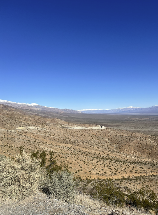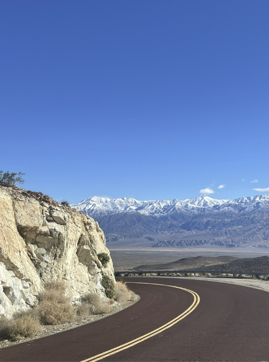 해가 떠오를 즈음 서부영화 느낌이 물신나는 광야가 나온다. 이건 바로 Death valley에 거의 다와간다는 신호이기도 했다. 광야를 달릴 수 있는 쭉 뻗은 도로, 그 너머에 있는 언덕같은 산, 그리고 그너머에 있는 눈덮인 산. 한편의 그림과 같은 풍경을 마주하니 말로 표현하지 못할 감격이 다가왔다. 이후로는 계속 산을 타는 도로를 타기도 하고 광야에 뻗은 도로를 달리며 계속 달렸다. 풍경이 좋아 운전이 지루하지 않았다.